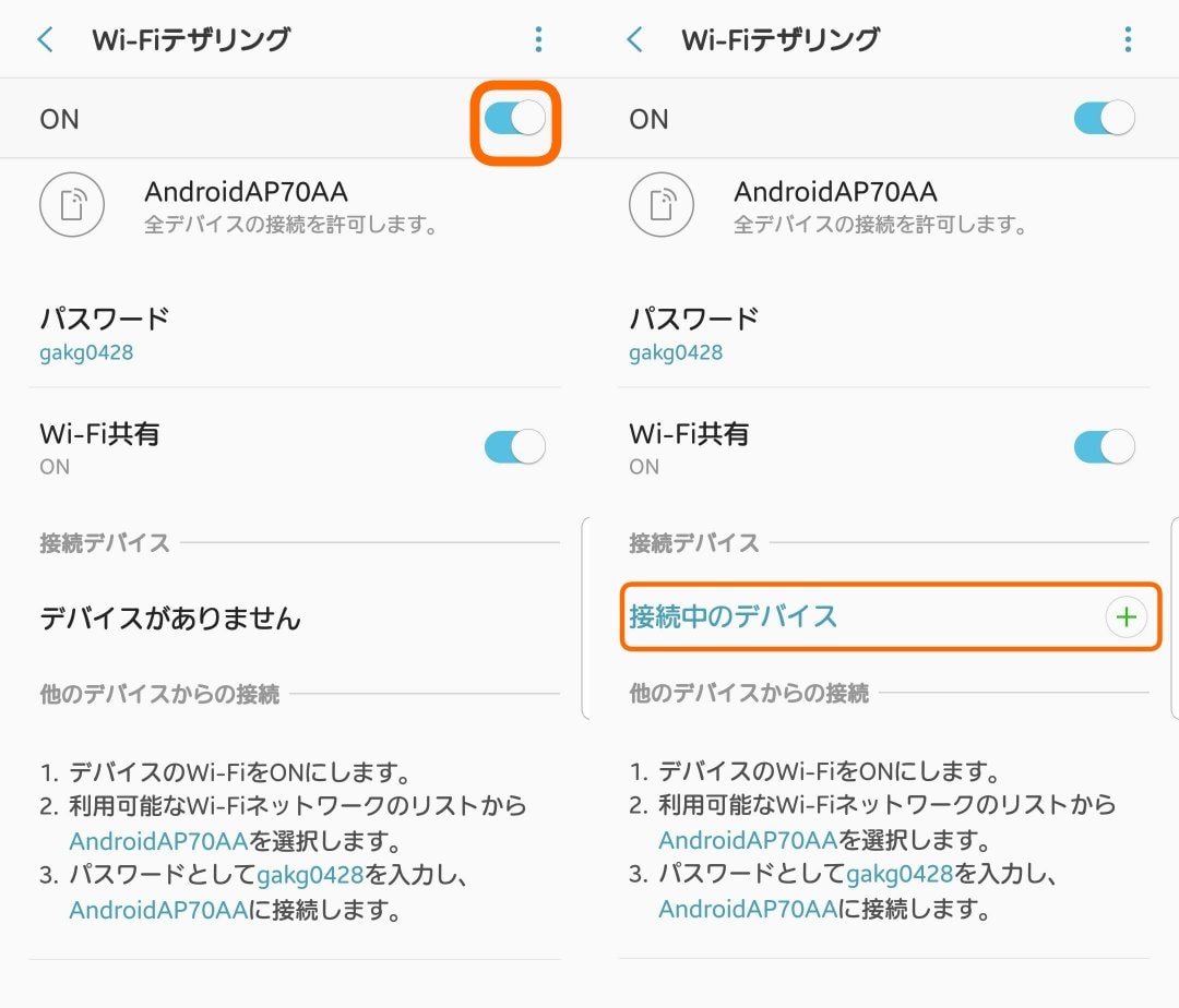 Wi-FI共有が開始されて、この後上部のトグルスイッチもONにすると他のWi-Fi機器からSSIDがみえるようになります。