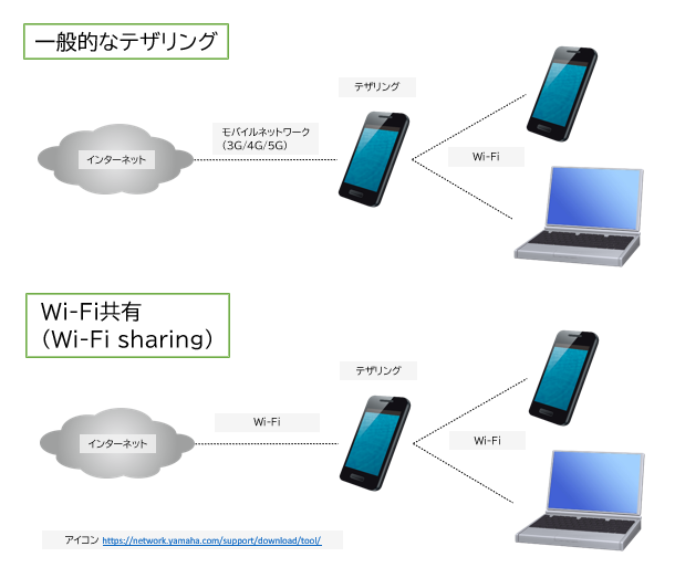 同じことはBluetoothテザリングでもできますが、子機側でBluetoothによるインターネット接続が可能である必要がある、通信速度が極端に遅い、接続台数が1台に限られる、といった制約があります。