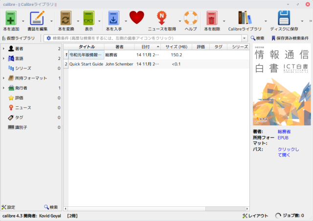 情報通信白書のepubファイル4をダウンロードした後、Calibreの「本を追加」からepbファイルを選ぶか、Calibreにドラッグアンドドロップします。