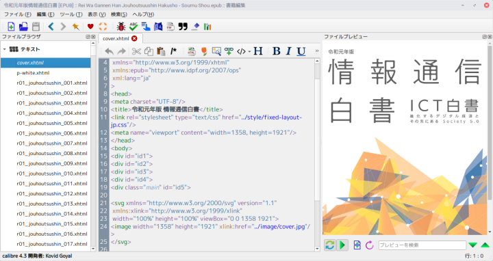 情報通信白書のepubはepubではありますが1ページ1画像ファイルになっていて、xhtmlファイルでjpegを表示している構造になります。この表紙の場合は下の方にimageタグがあり、そのxlink:href属性として"../image/cover.jpg"が指定されています。