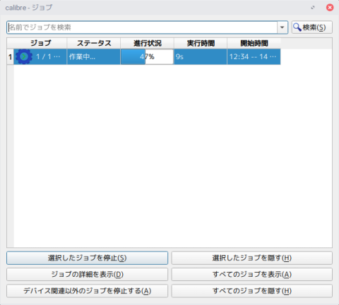 Calibre全体画面右下の「ジョブ数」が1になり、左側のアイコンがくるくる回っている部分はクリックできて、クリックすると実際に行われている処理の進捗が表示されます。