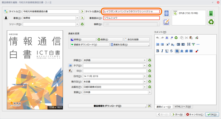 「タイトル読み」となっている部分を空欄または漢字で「令和元年版情報通信白書」とでも入力しましょう。