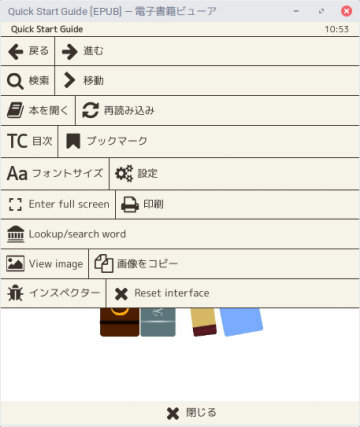 初回起動時のみ英語で色々表示されてますがEnterかマウスクリックで1ページ目に移動します。1ページ目は日本語ですが2ページ目以降は英語なので日本語ネイティブの人は2ページ目以降は辛いと思います。この電子書籍ビューアの操作方法は以下の通りです。