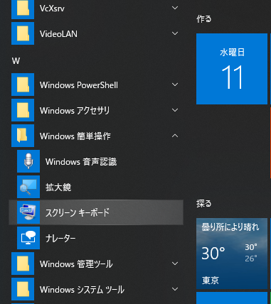 スタートメニュー→W→Windows簡単操作→スクリーンキーボード