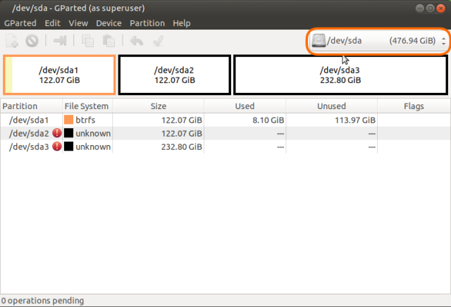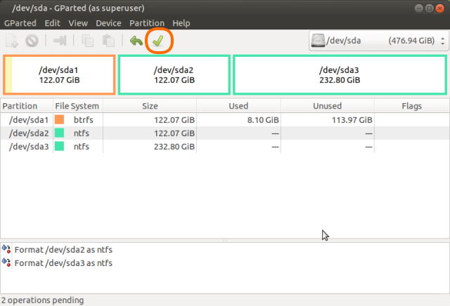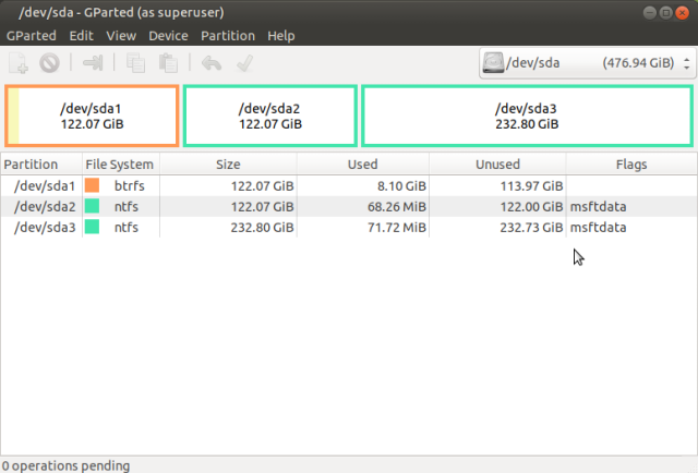 右上で/dev/sdaを選択するとインストール時に切ったパーティションが表示されるので、/dev/sda2と/dev/sda3を右クリックしてファイルシステムをntfsに指定。