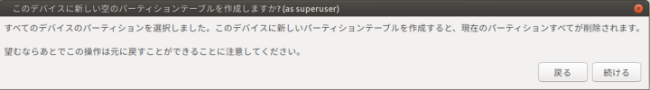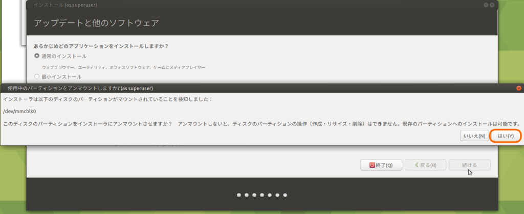 「このディスクのパーティションをインストーラにアンマウントさせますか?」と聞かれるので「はい」を選択します。