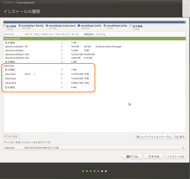 /dev/sdaの空き領域のところを右クリックしてパーティションを作成した後、インストール先にする先頭パーティションのマウントポイントを/に指定して先に進みます。なお、btrfsにしたのは単に好みの問題です。