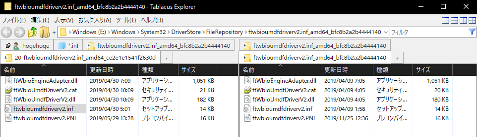 FTEとPIDなるものが違ってるのはわかりました。なので、デバイスマネージャーでダブルクリックしてドライバーのインストールでeMMCの「Windows/System32/DriverStore/FileRepository/ftwbioumdfdriverv2.inf_amd64_bfc8b2a2b4444140」を指定すれば問題なくインストールできます。