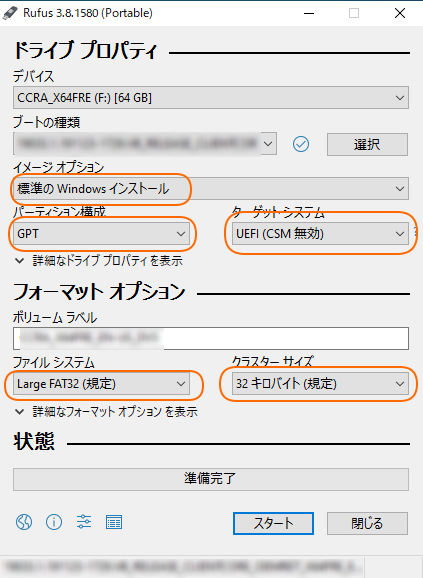 WindowsのISOイメージを指定すると、必要なオプションが自動的に設定されていくので、そのまま「スタート」ボタンを押してライブ起動するUSBメモリを作成します。