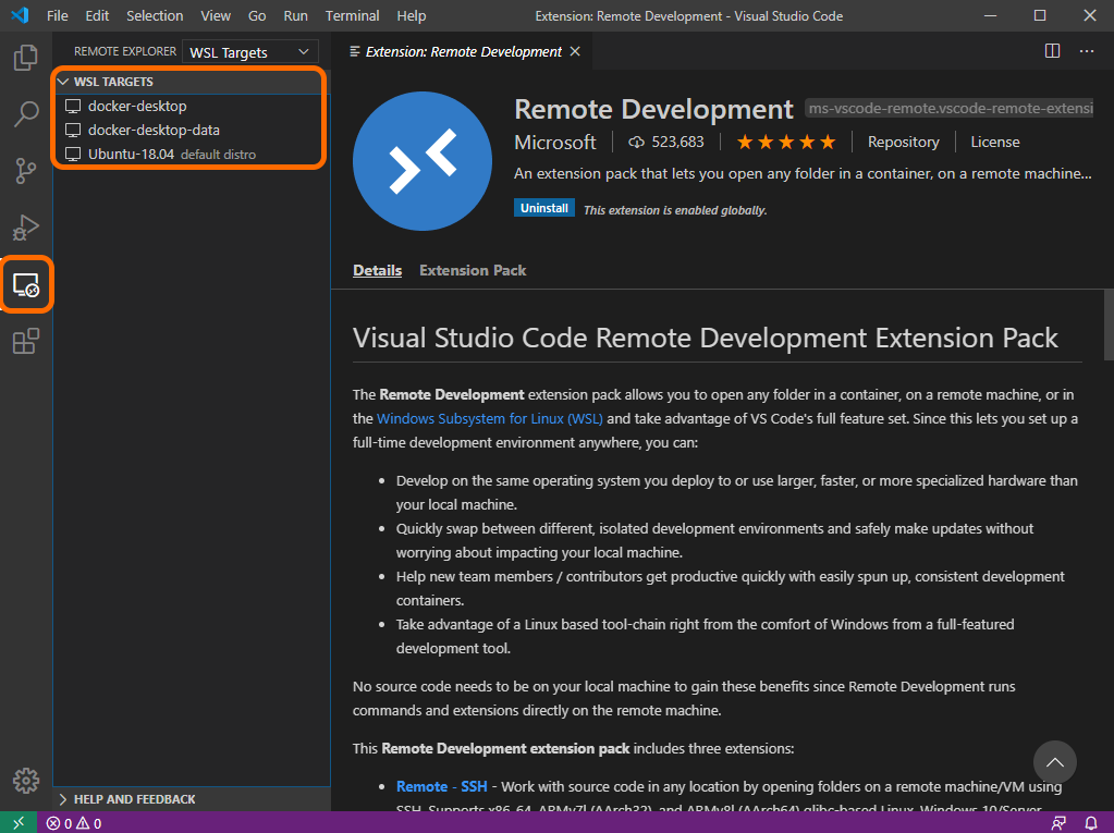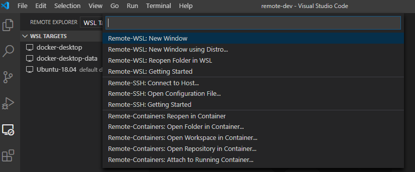 インストールが終わったらVSCodiumでは表示されることがないRemote Explorerをクリックすると自動的にDockerとWSLが表示されます。