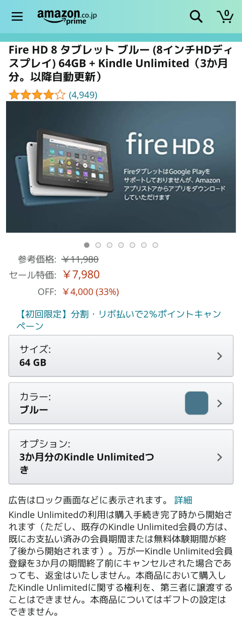 Amazonのセールで平時でも安いのにさらに安くなるFireタブレット。Fire HD 8 64GBの平時の値段は11980円で、それなりにサポートが付くタブレットでこの値段は既にかなりお買い得ですが、今回のAmazonブラックフライデー&サイバーマンデーセールでは4000円引きの7980円でした。助かる!