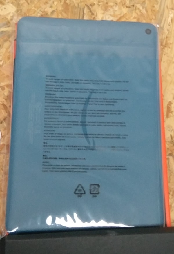 タブレットは袋に入っていて、子供がおもちゃにすると危ないという注意書きがあります。