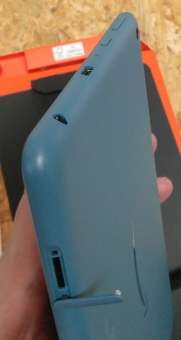 端子類は横置き時の右側に集中しています。音量、電源、USB Type-C端子、3.5mmイヤホン端子になっています。手前側に見えるのはスピーカーホールで、横置き時の上側の左右にあります。横置き時の左側には端子は何もありません。