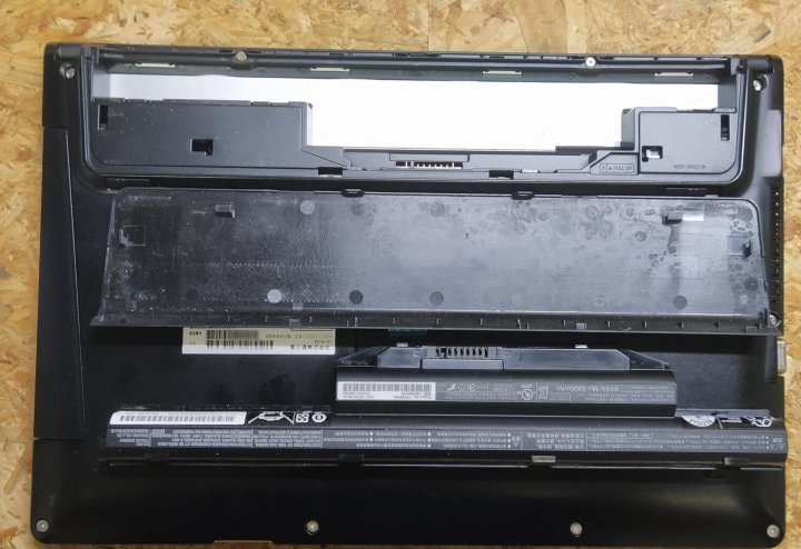 ビス10箇所を外します。バッテリー/ヒンジの2本は大きさが違います。モバイルマルチベイはダミーカバーの場合は中身が何もないので外さなくても問題ありませんでした。