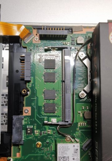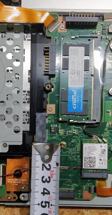中央がRAM(SO-DIMM)、右がM.2 SSDです。RAMの下はWLAN/BTと思われます。その左側のM.2スロットはWWANモデル用の空きスロットと思われます。