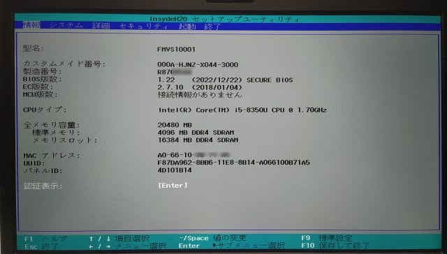 ひとまずBIOSで確認。RAMは無事に16384MB追加されて20480MB。