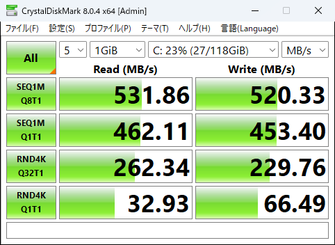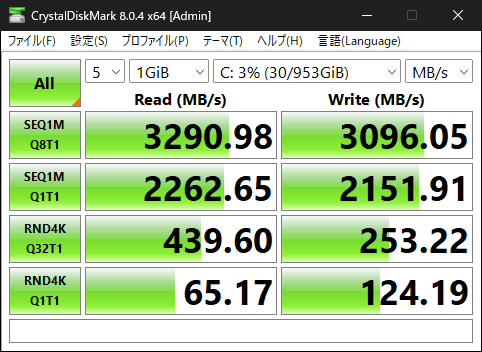 シーケンシャルはリードもライトもざっくり5.5倍、ランダムもリードは2倍、ライトも1.1〜2倍速くなるという驚愕の性能向上をしていました。古いSATAから最近のNVMeだとここまで差が出るんですね…