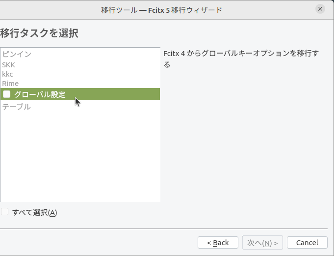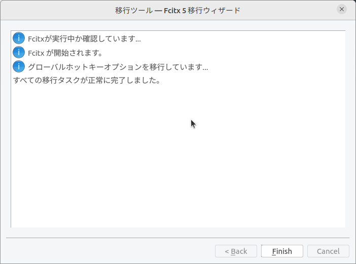 fcitx4を設定していた場合、ここにチェックを入れることができるグローバル設定が表示されるので、チェックを入れて先に進んで移行ウィザードを終了します。