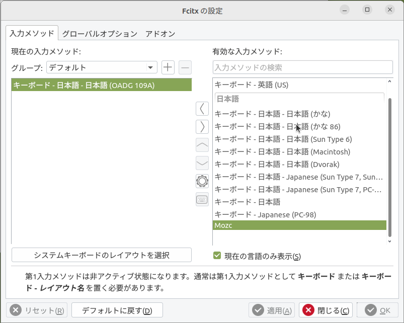 再起動してmozcで入力できることを確認したら、fcitx5をインストールする方向に進むも…