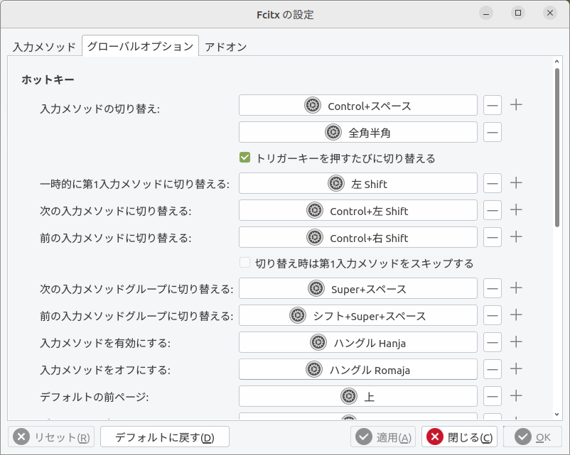 グローバルオプションタブは日本語キーボードなら全角半角キーがあるので入力メソッドからControl+スペースを削除(Eclipseの保管入力と被る)、一時的に第1入力メソッドに切り替えるの左Shiftも意図しない切り替えの原因なので削除。