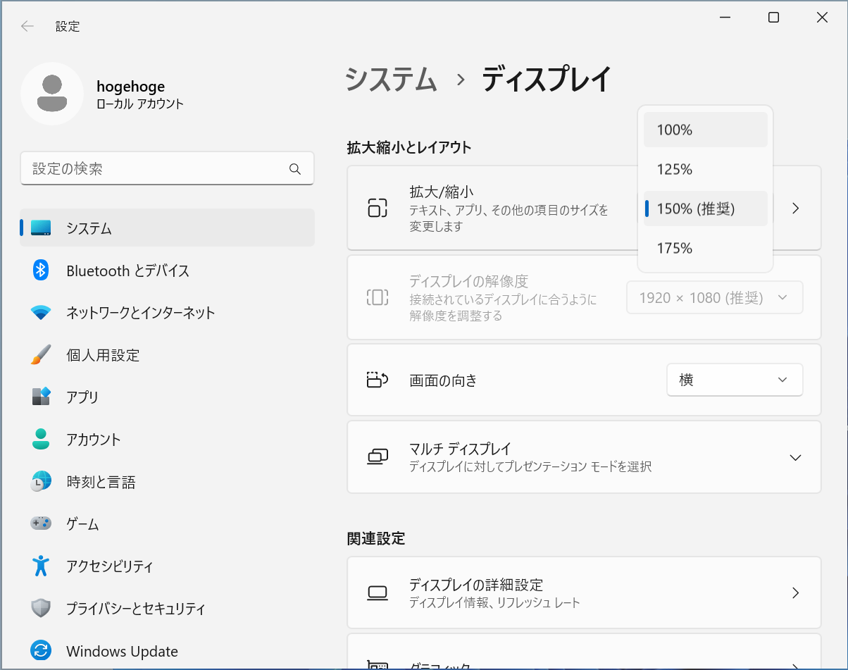 設定→システム→ディスプレイ→拡大縮小とレイアウト→拡大/縮小で100%を選択。