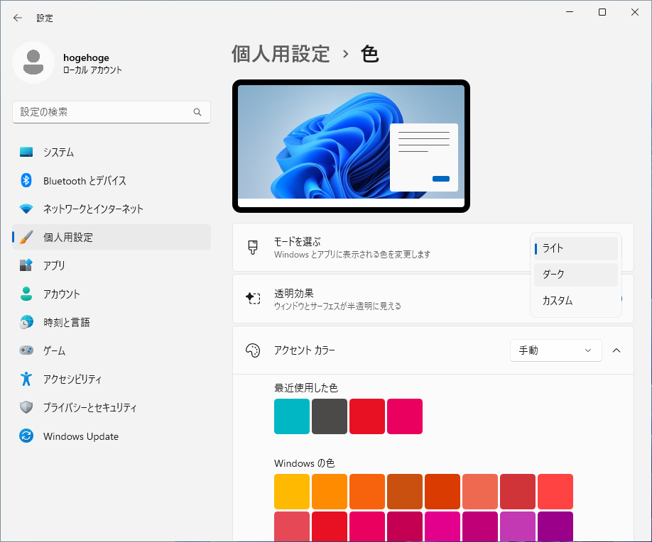 設定→個人的設定→色→モードを選ぶでダークを選択。