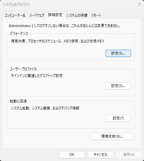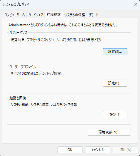 システムのプロパティダイアログの詳細設定タブのパフォーマンスの設定を選択