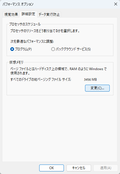 パフォーマンスオプションの詳細設定タブの仮想メモリの変更を選択