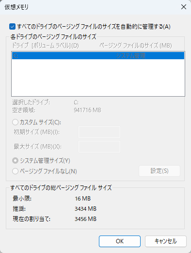 今回はRAMが20GBあって、RAMが枯渇するのはそれなりに対処をするべき状況と思えるので、SSDの寿命を長くするためにも当面ページファイルは使わないようにします。