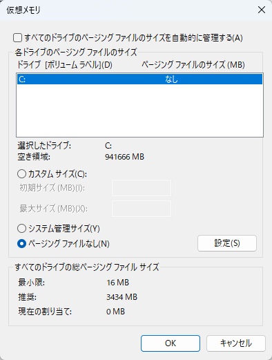 すべてのドライブのページングファイルのサイズを自動的に管理するのちチェックを外して、ページングファイルなしのラジオボタンを選択