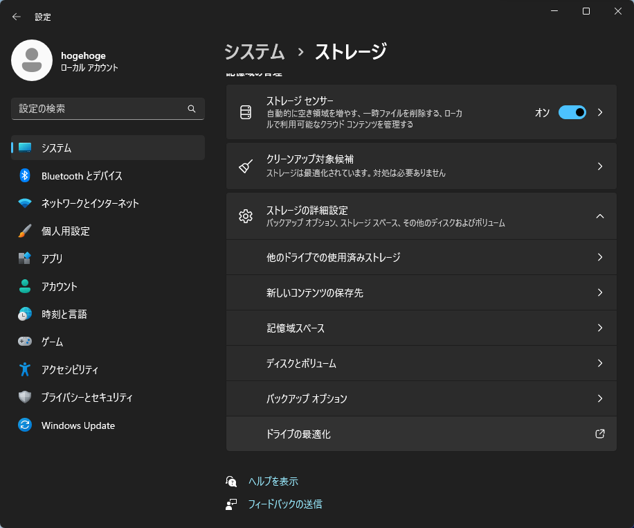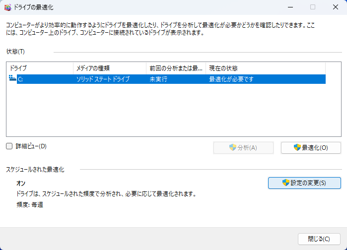 設定→システム→ストレージ→ストレージの詳細設定→ドライブの最適化を選択