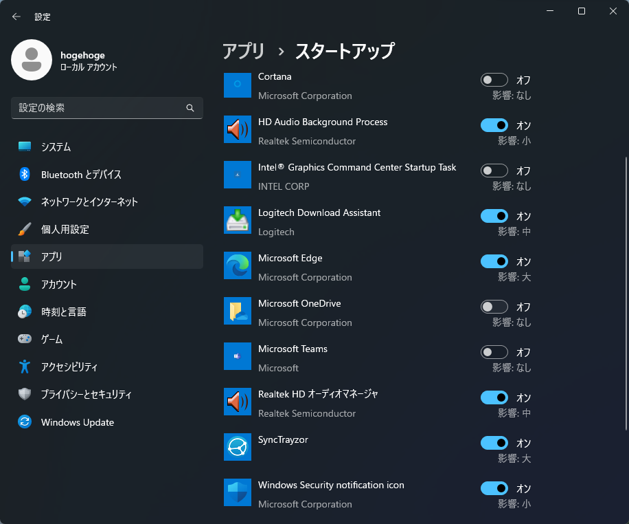 OS起動時に起動している必要のないアプリのチェックを外します。私はCortanaとIntel Graphics Command Center Startup TaskとOneDriveとMicrosoft Teamsを外しました。