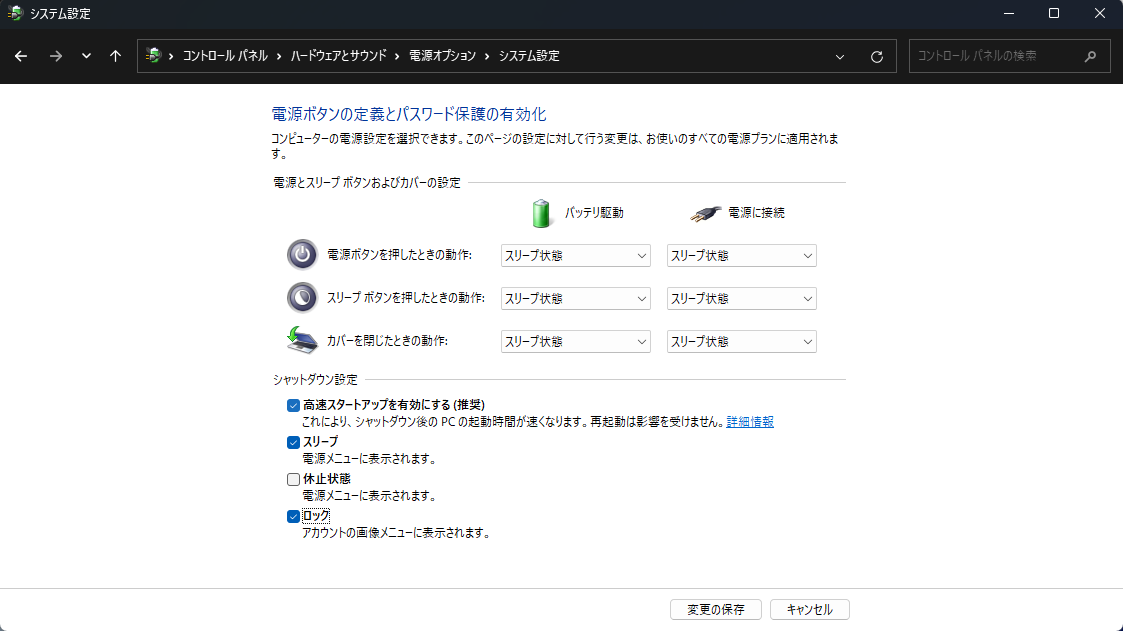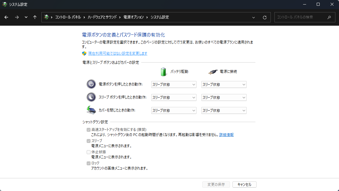 コントロールパネル→ハードウェアとサウンド→電源オプション→電源ボタンの動作の選択→現在利用可能ではない設定を変更します