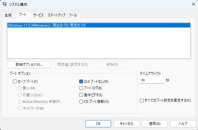 システム構成ダイアログのブートタブで起動ドライブを選択して ブートオプションのGUIブートなしをチェックして適用