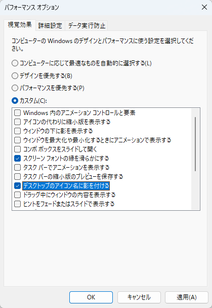パフォーマンスオプションの視覚効果タブでカスタムを選択、「スクリーンフォントの縁をなめらかにする」と「デスクトップのアイコン名に影を付ける」だけにチェックを付け、それ以外は全てチェックを外れていることを確認して適用