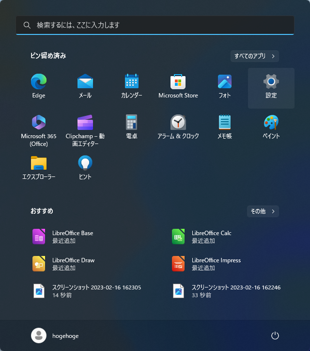 共通の操作として、設定はStartボタンを左クリックして表示されるピン留め済みの中から選びます。