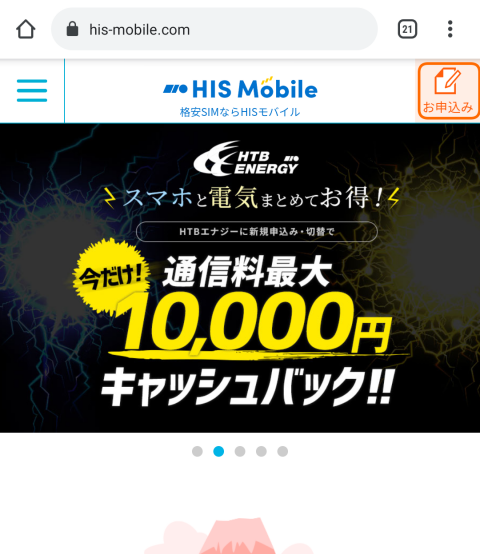 HIS Mobileのサイトで右上のお申し込みをタップ