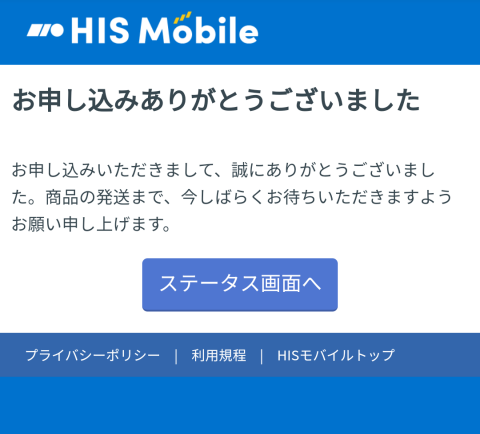 HIS MobileのSIMは日割りのような概念がなく、開通日〜翌月開通日の前日が初月、以降も同様のため、SIM発送がいつになるかがわからなかったんですが、結果的に