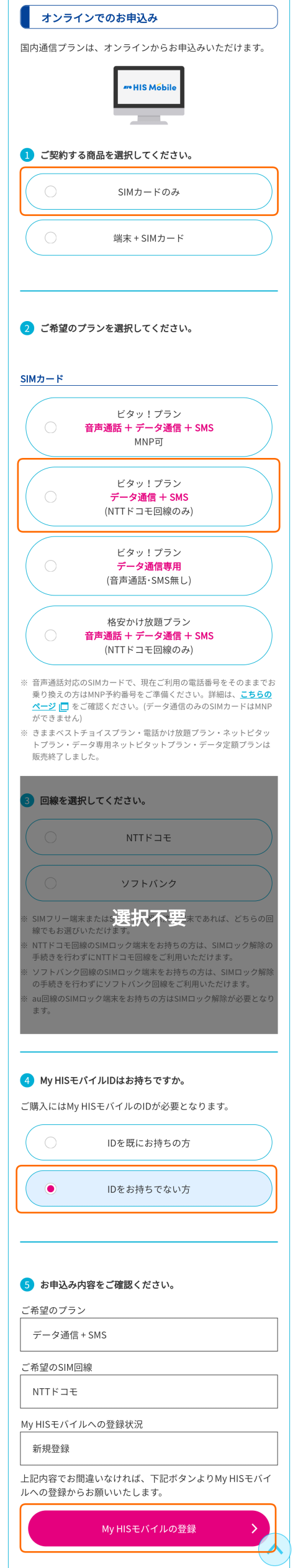 SMS付きのSIMカードを選んで行くと自動的にドコモ回線になります。My HISモバイルの登録をタップします。