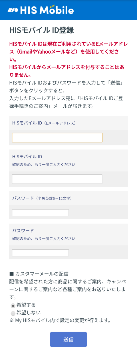 メールアドレスとパスワードを入力してMy HISモバイル IDを登録します。