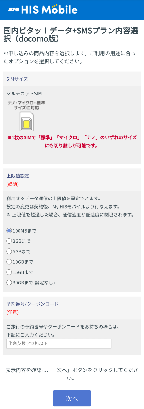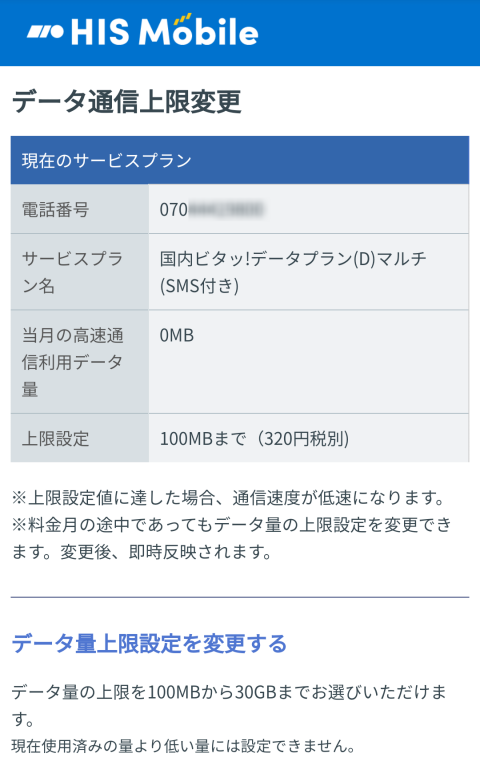 今回はエリア補完と100MB以内で抑えられる可能性があるのでHIS Mobieのビタッ!とプランを契約しました。
