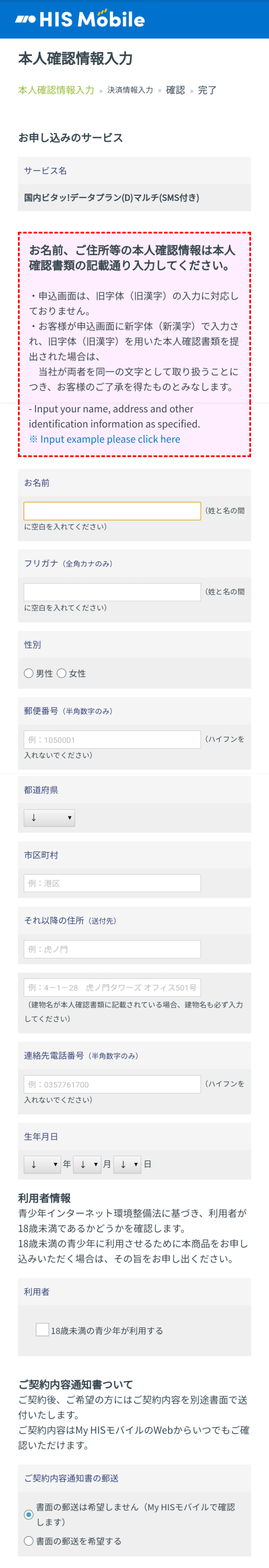 HIS Mobileのビタッ!とプランの契約