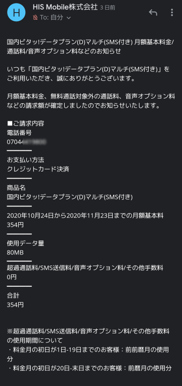 上記の通り、デュアルSIM端末で使っている状態ですが、初月の請求内容がメールで届いていました。内容は以下の通りです。