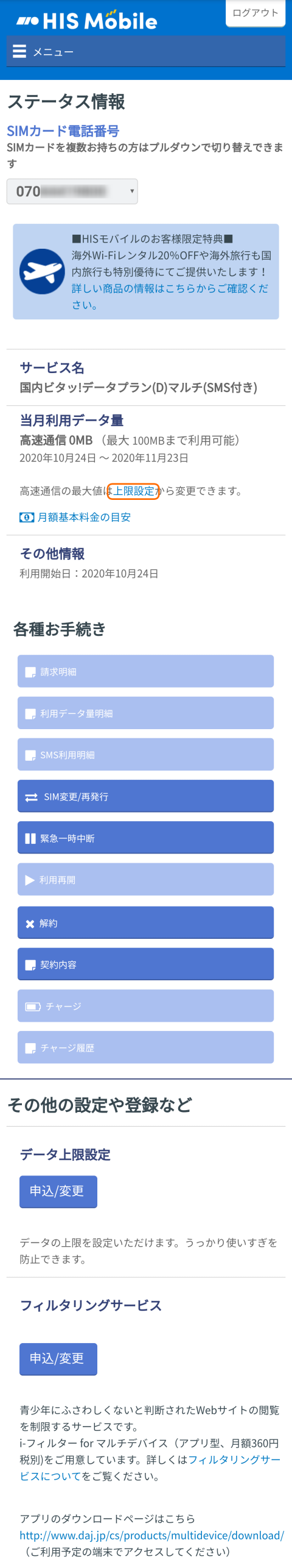 HIS Mobileにログインするとステータスを確認できます。当月扱いが10/24〜11/23に設定されていることがわかります。