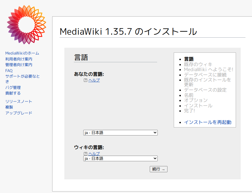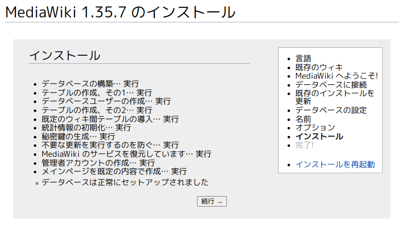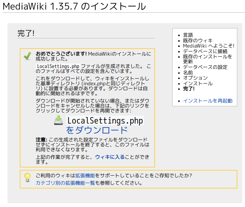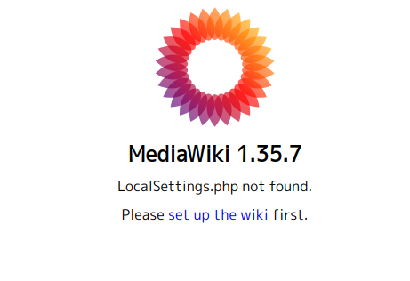 MediaWikiをセットアップしたことがある人には周知の事実ですが、MediaWikiは初回起動時に初期設定が必要で、これが終わるとphpファイル(LocalSettings.php)を吐き出します。2回目の起動以降は吐き出したphpファイルを読み込んでMediaWikiを実行します。