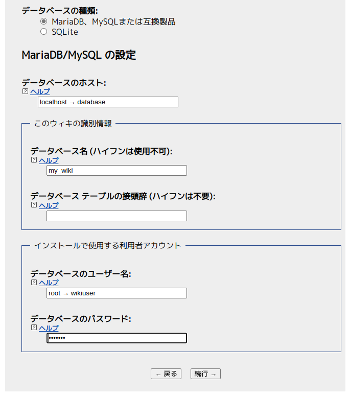 wikiuser(services - database - environmentのMYSQL_USERのwikiuser) - データベースのパスワードは