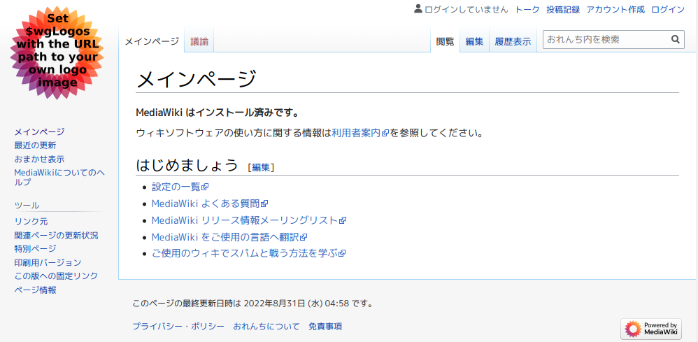 無事にMediaWikiが起動しました。あとはこのWikiを好きな様に編集していきます。