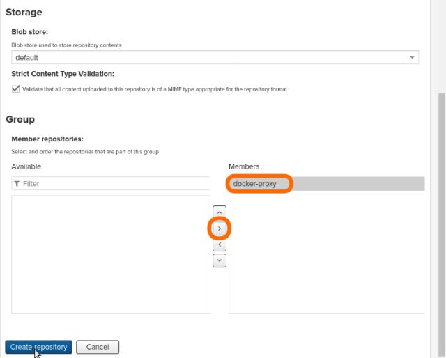 Groupリポジトリ(docker-group)に戻って、一番下のGroupのMember repositoriesに作成したdocker-hostedをMembersに追加します。