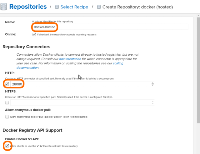 一番下のCreate repositoryをクリックすると、Hosted(docker)リポジトリが作成されます。