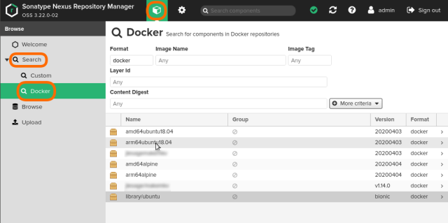 Nexusで管理しているDockerイメージを管理画面で確認します。左側のSearch→Dockerをクリックすると、管理しているイメージのうちFormatがDockerのものが表示されます。